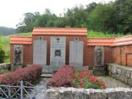 dem Eingang zum Friedhof, drei Steintafeln mit Namen,