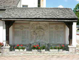 der Kirche; freistehend, überdachte Gedenkwand, in der Mitte Bildrelief "Soldat