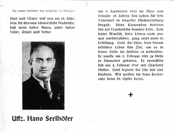 lt. VdK Unterscharführer; Kriegsgräberstätte in Mont-de-Huisnes (Frankreich) Verheiratet am 02.02.1930 mit Charlotte, geb. Müller; vier Kinder