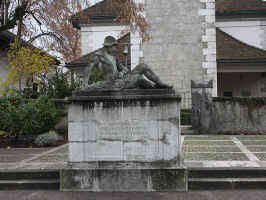 der Kirche; auf einem Sockel sitzender Soldat, Inschriften auf allen Seiten