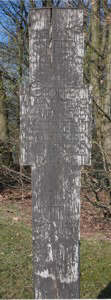 steht ein großes Kreuz. Dicht daneben steht ein Holzplatte mit