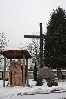 im Friedhof; Hochkreuz mit Gedenktafel, daneben Maria und Josef mit Jesuskind aus Holz geschnitzt