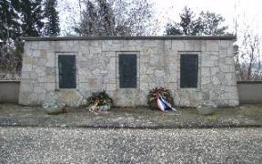 Auf dem Friedhof, eine mit Steinen verkleidete Mauer, an der drei Metallplatten angebracht sind.