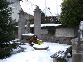 Kriegerdenkmal: Zwei Steinstelen mit herausgehauhenen Schwertern, oben jeweils ein Kreuz. In der Mitte der Stelen eine Jesus-Statue. In der gemauerten Einfassungswand sind drei große und eine kleine Steintafel befestigt.
