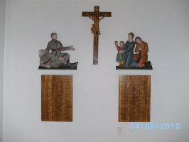 Denkmal in der Ortskirche. Mittig ein Kreuz und links daneben ein verwundeter Soldat mit seinem Kameraden bzw. rechts eine trauernde Familie. Darunter die Tafeln mit den Namen der Weltkriegsopfer.