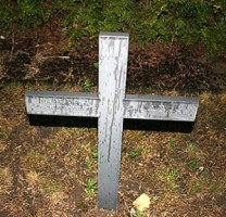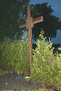 Stele auf dem Friedhof für die Gefallenen des 1. Weltkrieges Kriegsgräberstätte mit einem großen Holzkreuz und mehreren Metallkreuzen