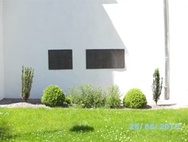 Gedenktafeln mit Inschrift und Namen der Opfer beider Weltkriege an der Außenmauer der Ortskirche.