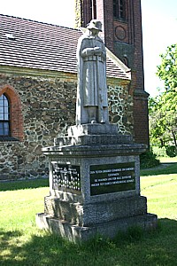 Soldatengestalt in demütiger Pose vor der KircheAm Sockel Inschriften