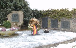 Ehrenmal vor dem Friedhof. Dort steht ein Findling mit einer Metalltafel; rechts daneben sind an der Friedhofsmauer drei Metallplatten angebracht.