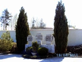 Granitsteindenkmal auf dem Ortsfriedhof. Steinplatten mit den Namen der Weltkriegsopfer und aufgesetzt drei Granitkreuze mit Inschrift. Ein Pflanzbeet, als Dekor.