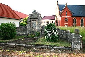 Bösleben, Gemeinde Bösleben-Wüllersleben, Ilm-Kreis, ThüringenPLZ 99310 Vor der Kirche steht dieses Denkmal für Gefallene des 1. Weltkrieges. Die Gedenktafel wurde offensichtlich entfernt. Die das Denkmal flankierenden Kugeln weisen die Jahreszahlen 1914 -1918 auf.