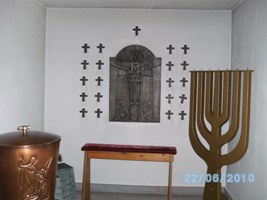 Denkmalsnische in der Ortskirche. Mittig ein Kupferbildnis und links bzw. rechts daneben Kreuze mit den Namen der Opfer des 2. Weltkrieges.