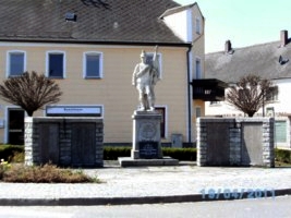 Denkmal in der Ortsmitte. Mittig ein lebensgroßer Soldat, auf einem Sockel mit Inschrift und Veteranennamen stehend, mit Fahne, Schwert und Siegerkranz geschmückt. Links und rechts daneben die Tafeln mit den Namen der Kriegsopfer.