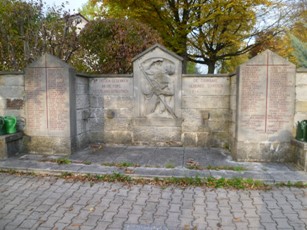 Vierflächige Steinsäule mit Inschrift und den Namen der Gefallenen, bekrönt von einem steinernen Stahlhelm auf Eichenlaub.