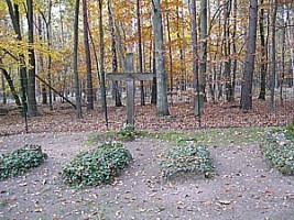 Vier Gräber mit unlesbaren Namensteinen und einem hölzernen Gedenkkreuz