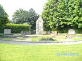 Denkmal auf dem Ortsfriedhof mit Inschriften und Namen der Opfer des 1. Weltkrieges in Rundbogenform und Bepflanzung. Der Opfer des 2. WK wird in Inschriftform gedacht.