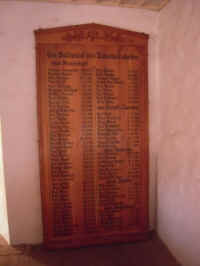 Auf der Empore der Noßdorfer Kirche steht eine Holztafel mit den Namen der Gefallenen des gesamten Kirchspiels.