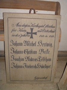 Tafel 1815: „Aus diesem Kirchspiel starben für König und Vaterland in den Jahren 1813 – 1815“