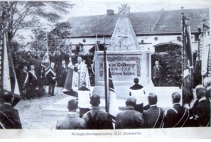 Urkunde Dieses Denkmal wurde errichtet im Jahr 1926 und am 26. September desselben Jahres eingeweiht. Es soll ein Zeichen inniger Dankbarkeit sein für 32 Söhne unseres Ortsteiles, von denen 30 im großen Weltkriege 1914 – 1918 ihr Leben dem Vaterlande opferten, während zwei ihr Leben im Polenaufstand 1921 dahin gaben. Ihre Namen sind auf den Marmorplatten zu lesen. – Der Gedanke des Baues ging aus von dem Krieger-Verein Kol. Goslawitz, der im Jahre 1914 gegründet wurde ….. Die Barmittel zum Bau stellten der Verein und ein großer Teil der Ortseinwohner zur Verfügung. Ferner spendeten die Zementindustriellen 150 Zentner Zement und die Stadt Oppeln schenkte den erforderlichen Kies. Die Fuhren zum Abholen desselben stellte ein Teil der hiesigen Fuhrwerksbesitzer kostenlos. Viele Mitglieder des Kriegervereins und der hiesigen Ortsgruppe des Landesschützenverbandes schachteten und beluden die Fuhren, ohne Bezahlung zu nehmen.