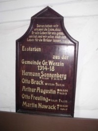 Tafel WK 1: „Es starben aus der Gemeinde Gr. Werzin 1914 – 18“