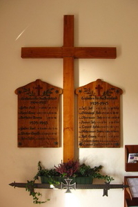 Im Eingangsbereich der Kirche befindet sich ein schlichtes Holzkruzifix sowie zwei Holztafeln mit den Namen der Gefallenen des