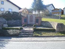 Das Kriegerdenkmal in Form eines Hufeisens befindet sich In der Ortsdurchfahrt. In einer halbrunden Sandsteinmauer stehen in deren Mitte drei höhere Mauerstücke an denen eine Sandsteinplatte sowie zwei Metallplatten angebracht sind.