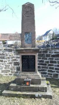 Vor dem Friedhof steht eine Sandsteinsäule auf einem zweistufigen Podest. Im unteren Teil sind die Namensplatten aus Marmor angebracht. Im oberen Teil ist eine Platte eingelassen, auf der eine Frau vor einem Soldatengrab kniet.