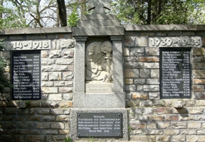 Ehrenmal in Herborn (Fußweg am Aulenrech-Wendehammer). An einer Feldsteinmauer das Relief eines knienden Soldaten mit Schwert. Rechts , links und darunter Namentafeln.