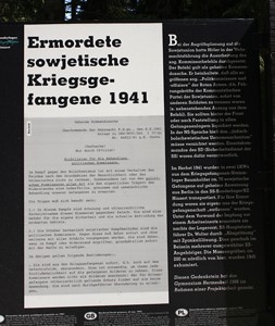 Informationstafel beim Gedenkstein: Bei der Angriffsplanung auf die Sowjetunion hatte Hitler in der Wehrmachtsführung die Ausarbeitung des sog. Kommissarbefehls durchgesetzt. Der Befehl galt als geheime Kommandosache. Er beinhaltete, dass alle ergriffenen sog. „Politkommissare und -offiziere“ der Roten Armee, d.h. Führungskräfte der Kommunistischen Partei der Sowjetunion, sofort von anderen Soldaten zu trennen waren (s. nebenstehenden Auszug aus dem Befehl). Sie sollten hinter der Front oder nach Feststellung in allen Gefangenenlagern liquidiert werden. In der NS-Sprache hieß das, „jüdisch-bolschewistisches Untermenschentum“ müsse vernichtet werden. Einsatzkommandos des SD (Sicherheitsdienst der SS) waren dafür verantwortlich.
