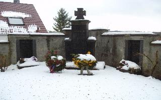 Ehrenmal an der Friedenslinde. In einem eingezäunten Bereich befinden sich die Gedenksteine aus schwarzem Marmor. Die beiden äußeren sind in die Wände eingelassen.