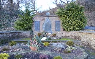 Ein Steinfindling, der in einer Einfassungsmauer eingelassen ist, trägt eine Metallplatte. Rechts und links daneben befinden sich Marmorplatten die ebenfalls in die Mauer eingelassen sind. Davor eine kleine gepflegte Anlage die von einer Sandsteinmauer umrahmt wird.