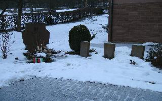 Auf dem Friedhof stehen drei kleine Gedenksteine sowie ein Gedenkkreuz, aus Sandstein.