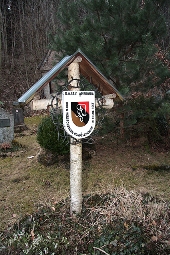 6020 Innsbruck (Tummelplatz - Ambronia), Tirol, Österreich:im Stadtteil Amras, im Soldatenfriedhof „Tummelplatz“; überdachtes Birkenkreuz mit Tafel in Wappenform mit Dornenkranz