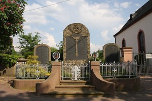 vor dem Friedhof; drei Gedenksteine, mittlerer erhöht und auch auf Rückseite beschriftet