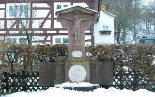 Das Kriegerdenkmal steht In der Ortsdurchfahrt. Es ist aus Sandstein. Oben mit einem gekreuzigten Jesus, darunter zwei ovale Marmortafeln. Daneben stehen noch zwei Grabsteine.