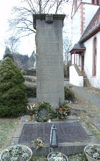 Zwischen der Wehrkirche und dem Friedhof steht eine aus mehreren Quadern bestehende, sich nach oben verjüngende Steinsäule. Auf der Rückseite eine Soldatenfigur, auf je einer Außenseite das hessische sowie das Ortswappen. – Davor befindet sich eine Metalltafel, die durch Steine eingefasst ist.