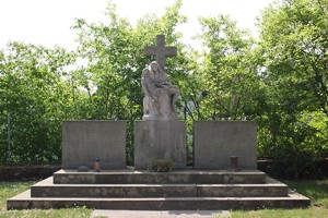 im Friedhof; Denkmal auf einem dreistufigem Podest, mittlerer Teil mit Steinplastik und Kreuz; zusätzlich Hinweise zu Soldaten von privaten Gedenksteinen