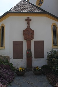 zwei Gedenktafeln aussen an der Kirche, dazwischen Kreuz