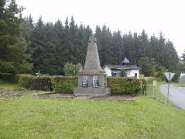 Vor dem Friedhof steht auf einem Steinsockel eine nach oben konisch zulaufende Säule mit einem Kreuz. Vorne auf der Säule hervorgehoben ein Stahlhelm umrahmt mit Lorbeer-Eichenblatt-Ast und zwei Fahnen. Auf dem Sockel befindet sich an den vier Kanten je eine Steinkugel. Im Sockel. Eingefügt sind insgesamt vier Namenstafeln aus Marmor.