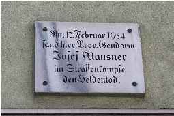 Am 12. Februar 1934 fand hier Prov. GendarmJosef Klausnerim Strassenkampfe den Heldentod.