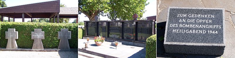 Oben auf dem Denkmal in der Mitte ein bronzenes Kreuz und rechts und links ein steinernes Ehrenkreuz. Seitlich des Denkmals befinden sich je drei Gräber mit Steinkreuzen von Gefallenen des 2. Weltkrieges. Davor erinnert ein Gedenkstein an die getöteten Opfer des Bombenangriffs am Heiligabend 1944.