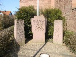 Links vom Eingang der Kirche St. Barbara, befindet sich das Kriegerdenkmal, bestehend aus drei Sandsteinplatten. Die mittlere hat die Form eines Kreuzes mit Inschrift. Die beiden Namenssteine laufen nach oben leicht konisch zu.