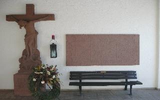 Eine Sandsteintafel und ein Sandsteinkreuz in einem offenen Gebäude nahe des Friedhofes.