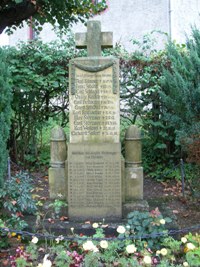Freistehendes Denkmal mit Eisernen Kreuz am oberen Ende und Trauerflor über der Namentafel für die Gefallenen des 1. Weltkrieges. Darunter Namentafel für die Gefallenen und Vermissten des 2. Weltkrieges. Die Seiten des Denkmales zieren 2 Granaten auf eigenen Sockeln.