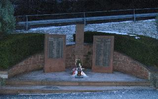 Auf dem Kirchenvorplatz in Niedersteinbach steht links – eingerahmt von Buchsbäumen – eine Sandsteinstele, daneben jeweils ein Sandstein Block mit daran befestigter Metalltafel. Darauf links die Opfer aus Brücken, rechts die Opfer aus Niedersteinbach
