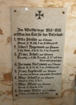 In der alten und von einem sehr aktiven Förderkreis liebevoll restaurierten Kirche Gedenktafeln für die 3 Kriegstoten von 1866, einen Kriegstoten von 1871 sowie vom Ersten Weltkrieg mit 8 Namen.