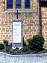 Denkmal neben der Kirche. Steinsäule mit Metallkreuz, Inschrift und Namen der Weltkriegsopfer. Umsäumt von einem Pflanzbeet.