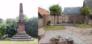 Sandsteinstele mit deutschem Kreuz. Kriegerdenkmal in der Ortsmitte. Eine V-Förmige mit Sandsteinen verkleidete Wand. In der Mitte eine Jesus-Figur. Daneben zwei Inschriftenpatten, sowie vier Namenstafeln aus Marmor.