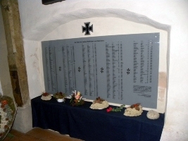 1. Weltkrieg (auf beiden Tafeln oben) Zum Gedächtnis der Opfer im Weltkriege 1914-1918 Linke Tafel (unten) „Niemand hat größere Liebe denn die, daß er sein Leben läßt für seine Freunde“ (Joh. 15.13 Rechte Tafel (unten) Euer Blut, das Ihr vergossen Nimmer soll’s umsonst geflossen, Nimmermehr vergessen sein