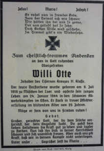 Dienstgrad Name Vorname Geburtsdatum & Ort Todesdatum & Ort Bemerkungen Obergefreiter OTTE Willi 09.07.1919 Müschen b. Laer 24.01.1944 im Osten EK II.Klasse Datum der Abschrift: 06.07.2010 Beitrag von: www.os-gen.de Foto © 2010 Werner Bohnenkamp